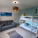 Op de benedenverdieping buitenom bereikbaar zijn nog twee slaapkamers. In de eerste kamer is een tweepersoonsbed en in de achterste kamer staat een stevig stapelbed en een slaapbank waar eventueel nog twee kinderen/personen op kunnen slapen. Ook vindt u hier de derde badkamer met douche waarin de wasmachine en droger staan.